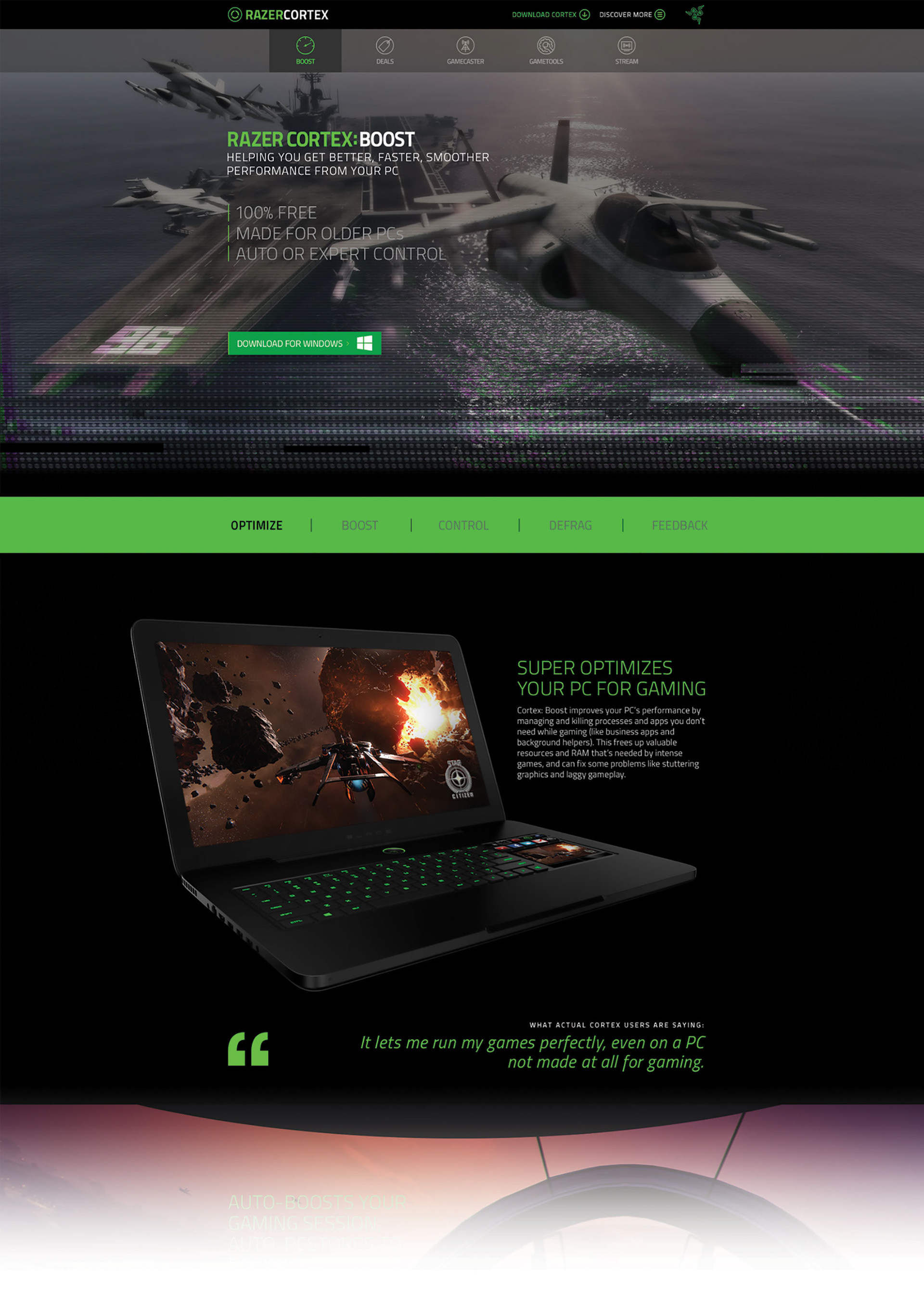 As one of the pioneer software services created by Razer, the Cortex site was in need of refreshed website that would introduce and cover all its features. With its game-centric design, the site features animated backgrounds from popular PC games as well as easy-to-digest content broken down into carefully planned sections that enable easy reading by consumers.